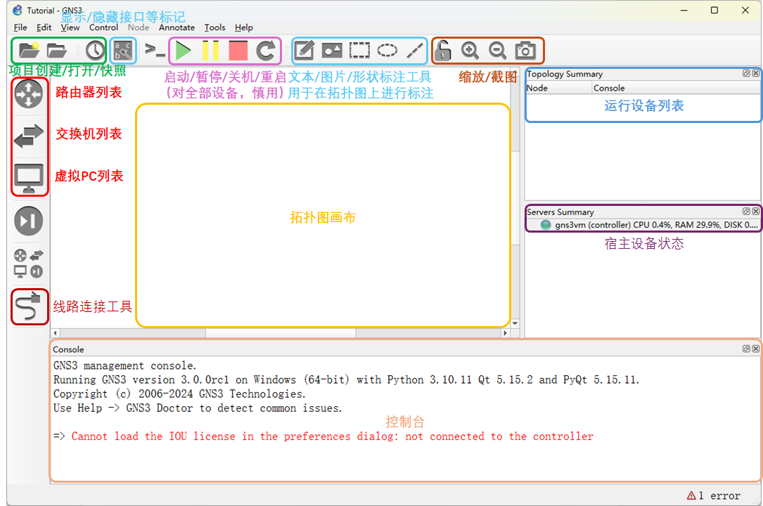 路由器的配置分为运行配置与启动配置,所有的修改都直接作用于运行配置,而设备启动时会将启动配置加载为运行配置,因此未经write写入的运行配置,在对设备或GNS3 VM关机/重启后均会完全丢失,请确保运行中时常进行配置的保存与快照的创建,以免误操作损失前序步骤成果