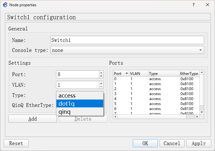 该交换机功能较为简单,仅能进行简单的VLAN设置,可对每个端口指定其VLAN及端口模式(dot1q→Trunk),也可根据需求增加端口数量