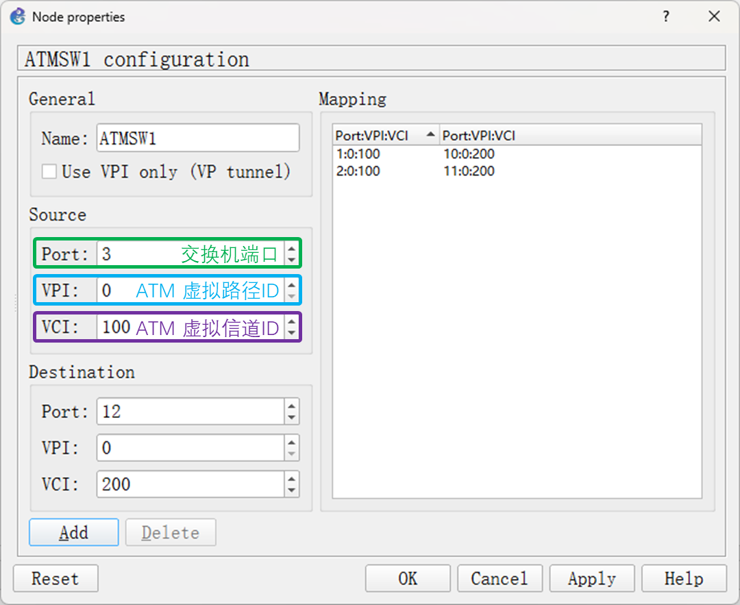 一个隧道由一对源和目标构成,每个源或目标各由Port、VPI和VCI三部分构成,其中Port表示交换机的物理端口,可与路由器进行连接;VPI表示虚拟路径ID(Virtual Path Identifier), VCI 表示虚拟信道ID(Virtual Channel Identifier)