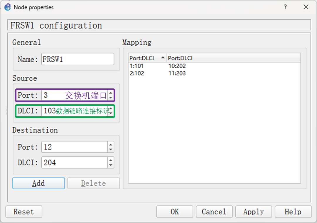 一个数据链路由一对源和目标构成,每个源或目标各由Port、DLCI两部分构成,其中Port表示交换机的物理端口,可与路由器进行连接;在Frame Relay中,DLCI表示数据链路连接标识(Data Link Connection Identifier)