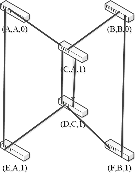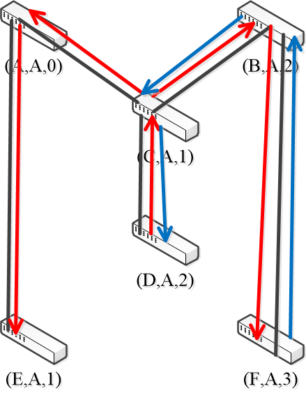 - For example: initially D want to send a frame to F (because F is previously unobserved by D, so each switch flooding the frame to the ports it connected except the incoming one. The red arrows denote the flooding process)