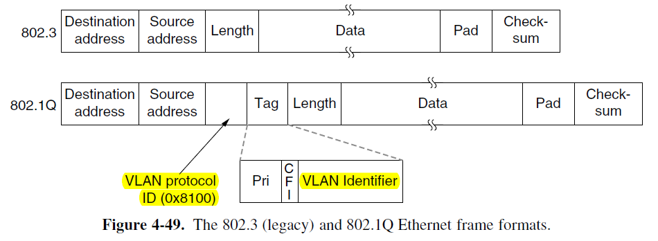 - VLAN protocol ID (0X8100) since this number is larger than 1500, all Ethernet cards interpret it as a type rather than a length.
